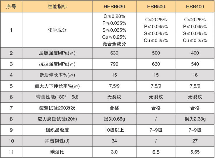 HHRB630鋼筋集熱軋螺紋鋼的外形尺寸、精軋(zhá)螺紋鋼的強度級別、HRB400級抗震鋼筋的延伸率為(wéi)一體,采用科學配方(fāng)和創新熱軋工藝製成。產品攻克了(le)業界困惑多年的鋼材高強度與高塑性兼容的技術難關,滿足國家(jiā)現行建(jiàn)築規範(fàn)的技術要求。